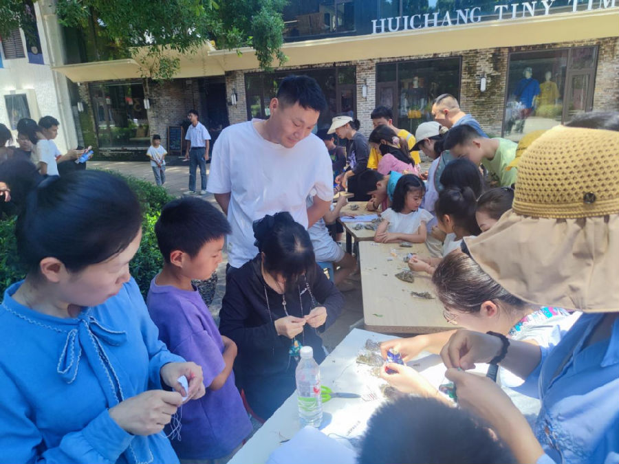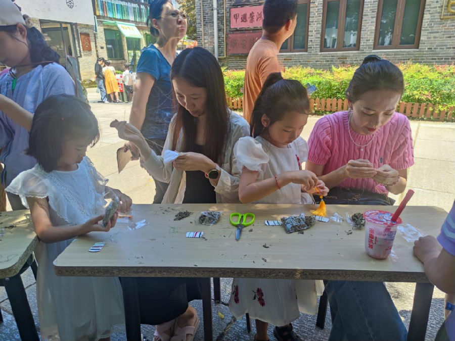 在工作人员的耐心指导下,制作环节正式开始:穿针引线、填充香料……大家全神贯注,精心雕琢着自己的香囊。现场尤其温馨的是亲子协作的画面——家长们手拿银针熟练穿线,小朋友们捧着香料小心翼翼的地往香囊里塞,艾草的清香混着欢声笑语弥漫开来,勾勒出一派其乐融融的手工创作场景。