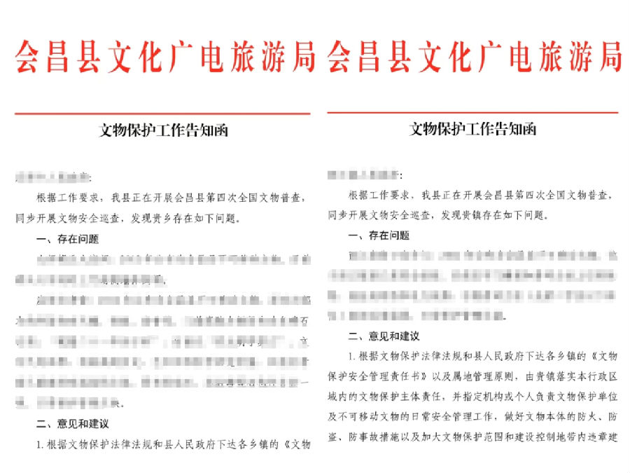 在实地调查过程中,普查队员发现部分乡镇不可移动文物点存在安全隐患,并立即明确责任单位,下发文物保护工作告知函,确定整改措施和完成时限,及时排除安全隐患,确保文物安全,做到立行立改。