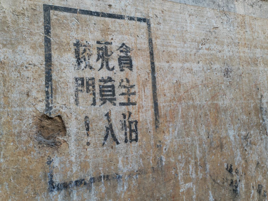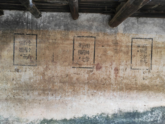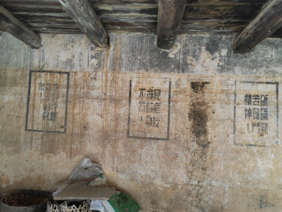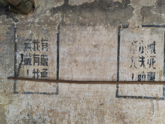普查队于近日到西江镇开展“四普”文物现场调查、信息采集,在镇、村两级干部的指引下,我县“四普”工作人员在西江镇饼丘村河子口小组一许氏民居两侧横屋内墙壁上发现有多处标语,“贪生怕死莫入校门,实干、苦干、硬干、快干,时时作为国之准备,有敌无我有我无敌”等标语。但该标语和红军标语有明显的区别,对此,我县“四普”工作人员对现场作了拍照留存、信息采集,经调查该民居建于民国时期,土木结构,悬山项,为一中厅两横屋构成,现无人居住。