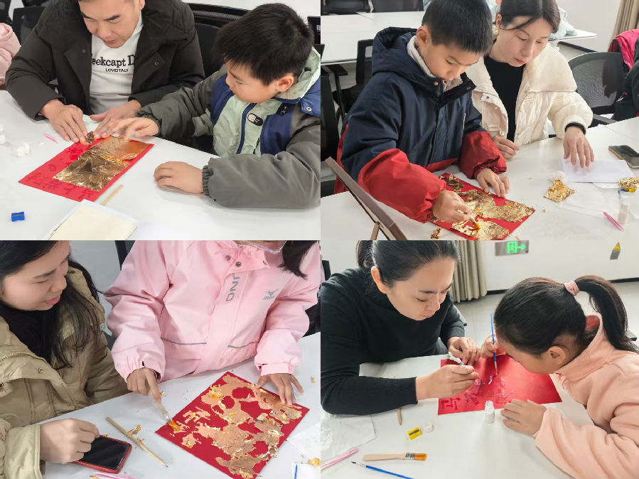手工创作环节,家长与孩子根据骏马、福字等新春模板描摹轮廓,细心涂抹胶水,再小心翼翼贴上金箔。孩子们专注投入,家长耐心指导。指尖翻飞间,普通的卡纸被金箔点缀得熠熠生辉,欢声笑语中,亲子情谊愈发浓厚。