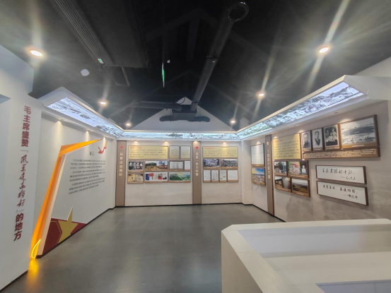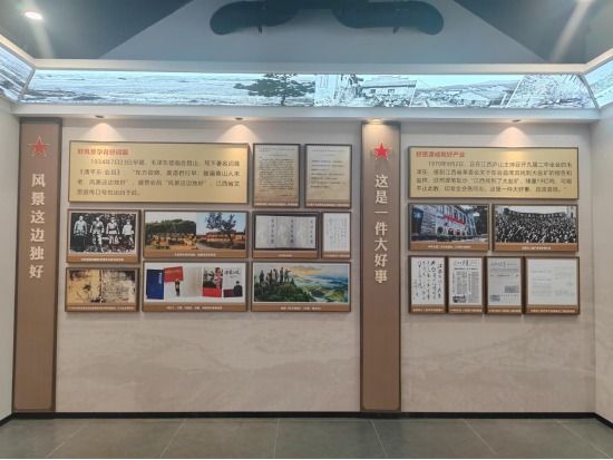 展厅里,会昌山水与历史建筑图景铺满廊灯上方,与下方的史料、图片相映成趣,仿佛让人一秒穿越到那段峥嵘岁月。陈列围绕三个“好”展开,每一篇章都藏着专属会昌的珍贵故事。