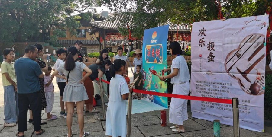 紧接着的“欢乐投壶”环节,更是将氛围推向了小高潮。选手们站在规定线后,瞄准壶口轻轻投掷,箭矢在空中划出优美的弧线,每一次“投中”都引来围观人群的阵阵喝彩。